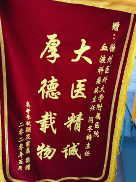 患者锦旗赠徐州医科大学附属医院血液科55病区桑威主任、闫冬梅主任 2020-07-03 09:02:48行风建设 2020-06-28锦旗徐州医科大学附属医院血液科55病区桑威主任、闫冬梅主任:大医精诚 厚德载物患者李秋颖及家属敬赠 二零二零年五月