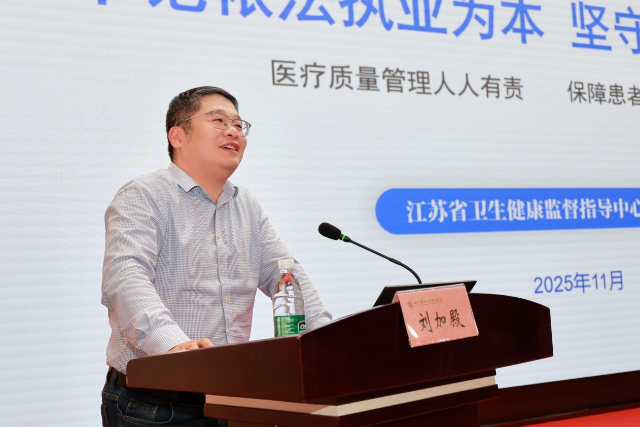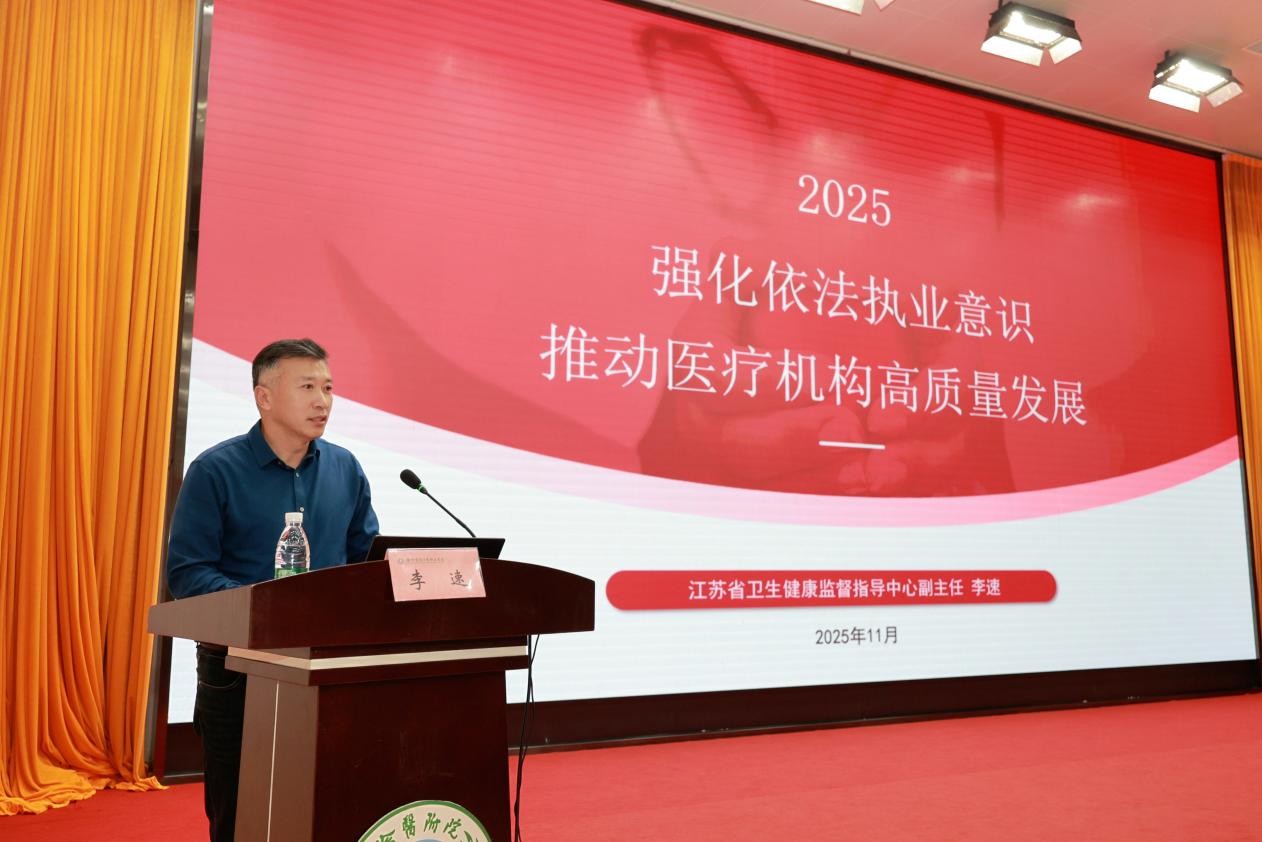 为持续强化医疗质量安全管理,提升医务人员依法执业能力,推动医院高质量发展,2025年11月19日,我院在12号楼第一会议室举办医疗质量安全专项培训。本次培训由医务处组织,主要面向前期在医疗质量安全记分管理中被记分的医生,旨在通过针对性强化学习,帮助大家筑牢思想防线、规范执业行为。金培生院长出席培训并致辞,江苏省卫生健康监督指导中心副主任李速、江苏省卫生健康监督指导中心医疗监督科科长刘加殿担任主讲专家,医务处处长刘筱主持培训。