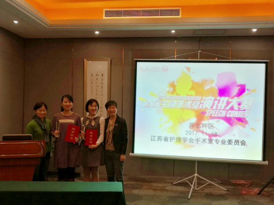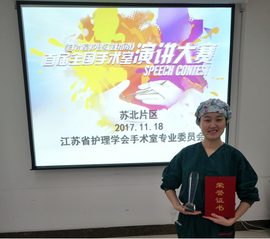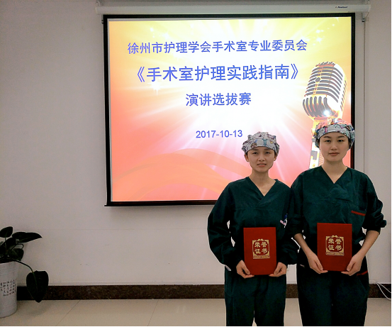 由江苏省护理学会手术室专业委员会主办的全国首届《手术室护理实践指南》苏北片区演讲大赛于2017年11月18日在徐州顺利举行。我院手术室的项晗、焦同彤两名选手以出色的表现斩获冠亚军。参加此次大赛的还有来自徐州市中心医院、连云港市第一人民医院及连云港市中医院手术室的选手。江苏省护理学会手术室专业委员会成员担任评委。